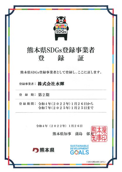| 建築業の許可 | 商号又は名称:水輝 特定建設業 (管工事業、水道施設工事業、土木工事業) 許可番号 熊本県(特-31)第13553号 一般建設業 (消防施設工事業) 許可番号 熊本県(般-31)第13553号 許可年月日 2019年4月1日 管工事一式総合建設業 |